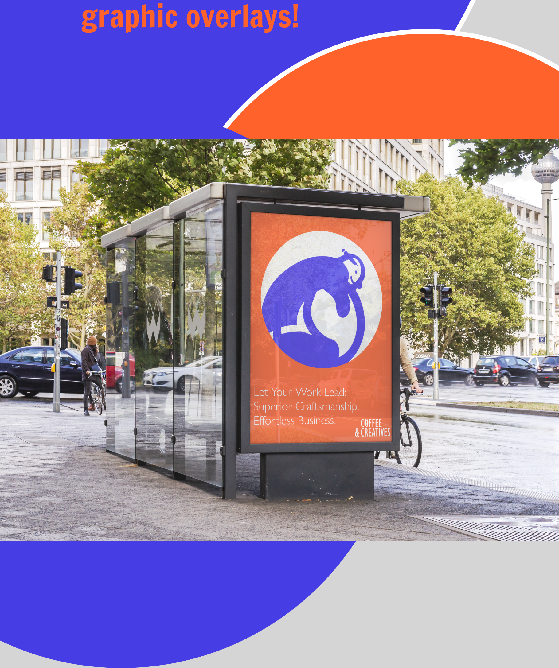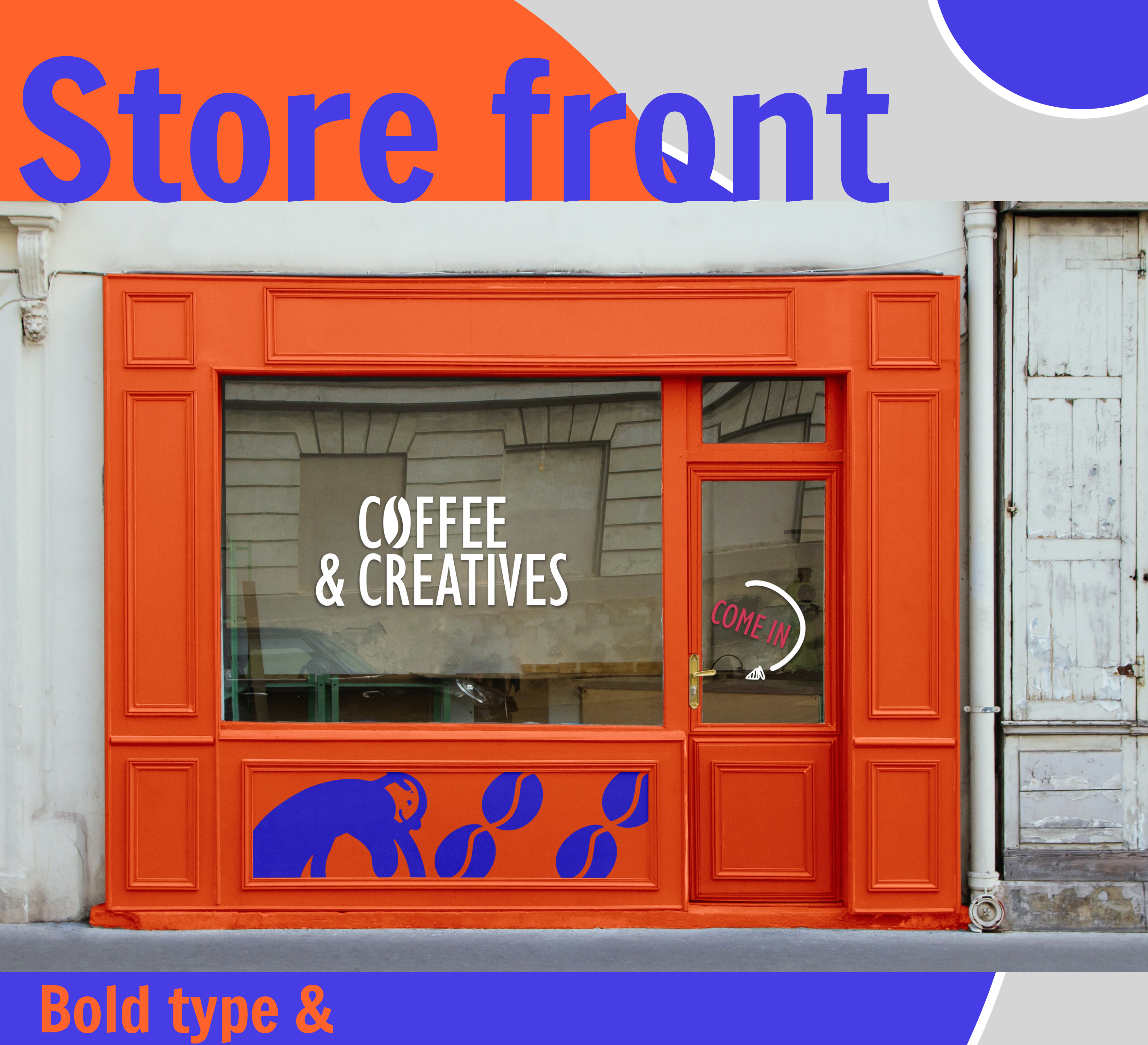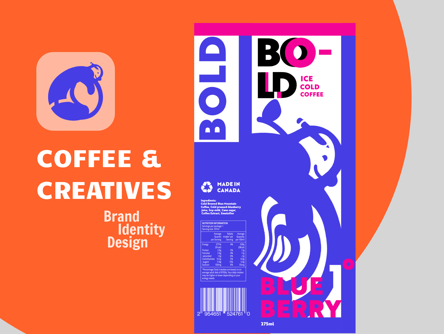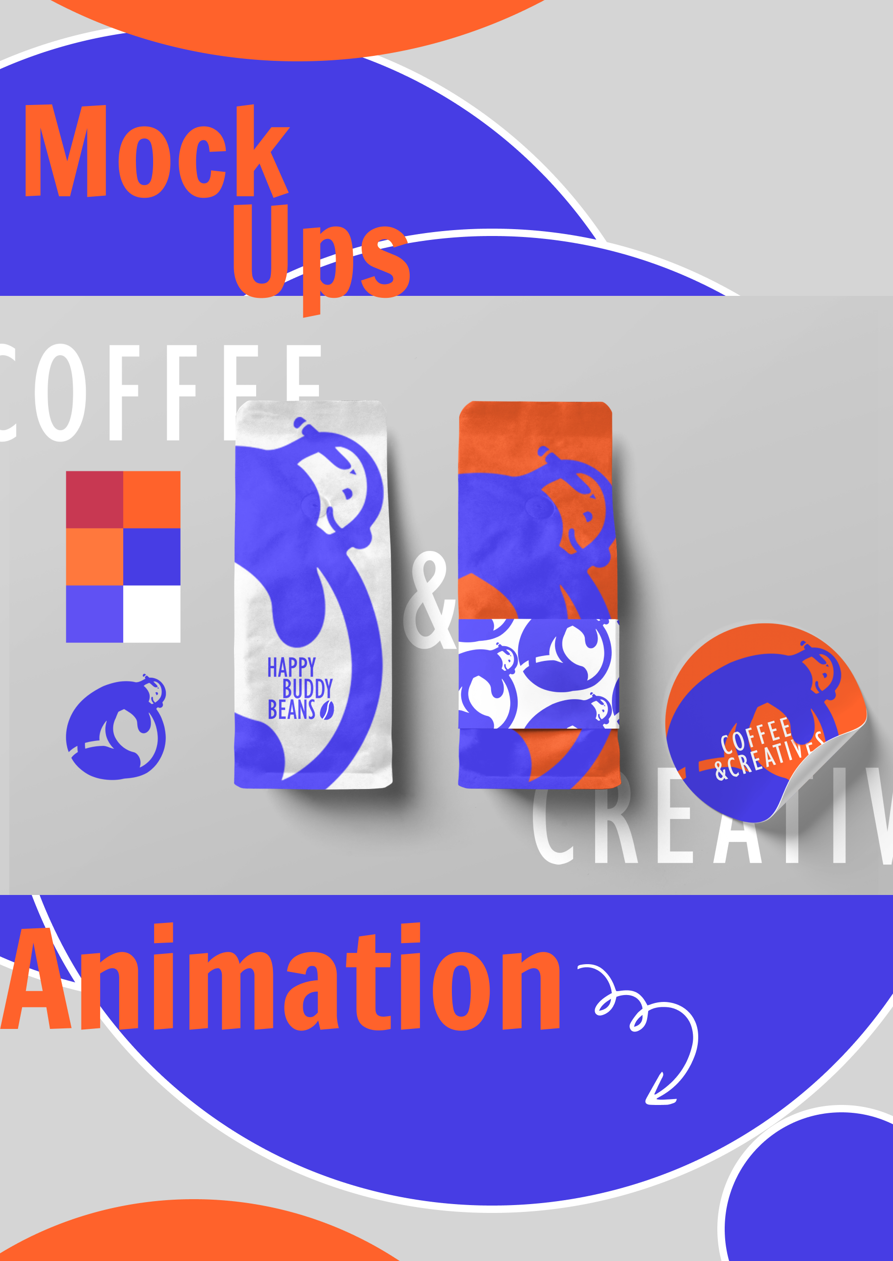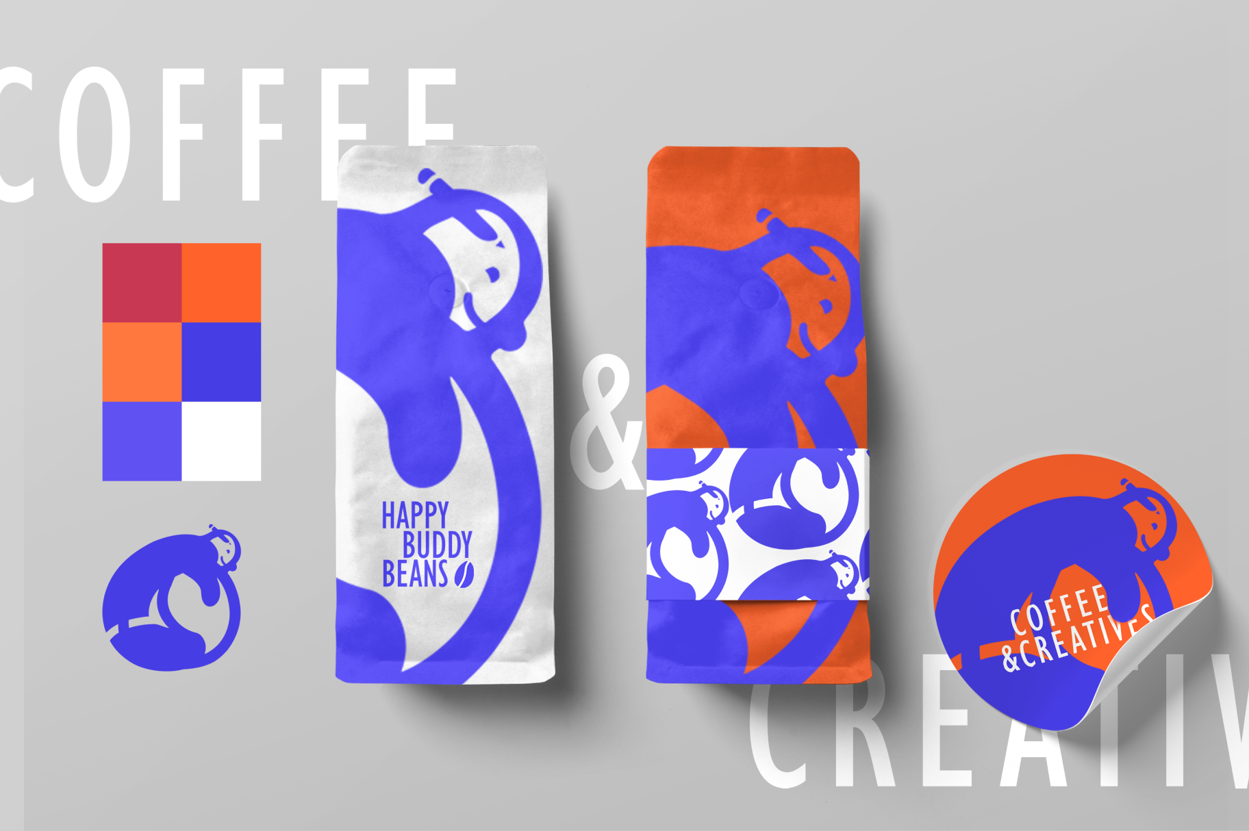 The brand is defined by a striking color palette of bold blue, warm orange, and crisp white, reflecting energy, creativity, and community